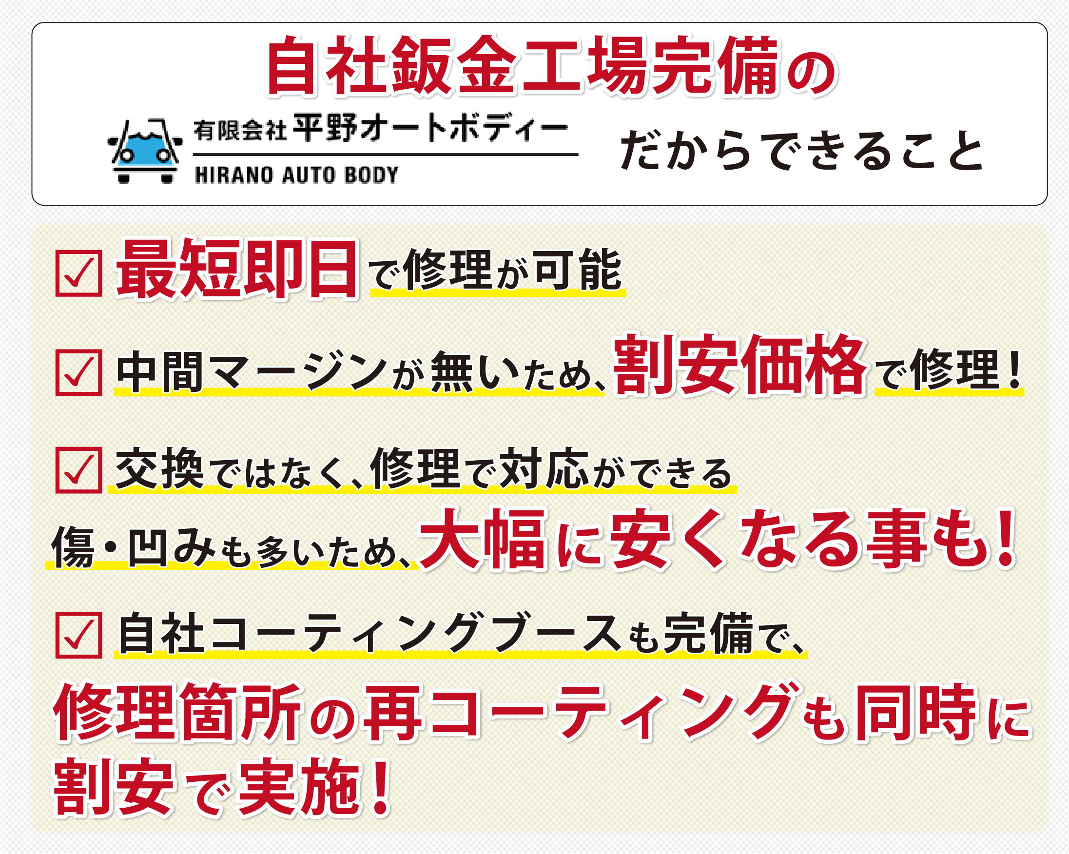 バンパー補修以外でも、修理完了まで1日~3日でお車のお引き渡しが可能です。